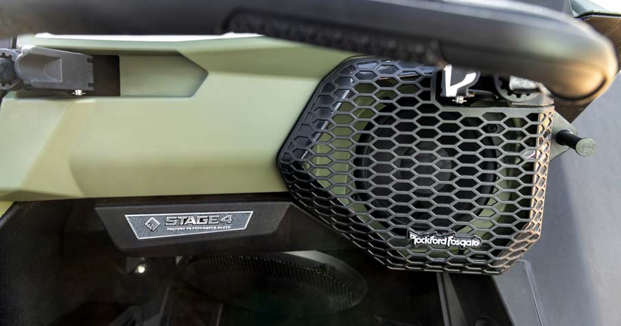 « Système audio Rockford Fosgate Stage 4 réglé et intégré en usine avec unité source RIDE COMMAND. Comprend (2) tweeters de 100 watts de 1 pouce, (2) haut-parleurs avant de 100 watts de 6,5 pouces, (2) haut-parleurs arrière coaxiaux de 100 watts de 6,5 pouces, (1) amplificateur de 400 watts à 4 canaux, et (1) subwoofer de 10 pouces avec amplificateur de subwoofer intégré de 400 watts. *Le système audio est testé en immersion dans l'eau IPX7 et IPX9K pour résister aux éléments humides.